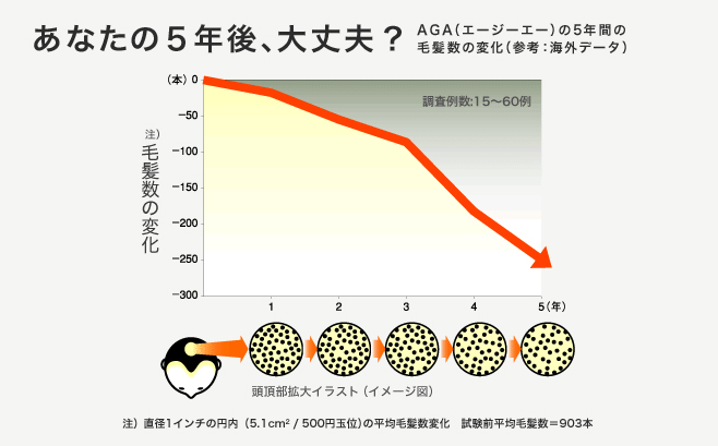 AGAは進行性です。何もせずにほうっておくと下記のグラフのように髪の毛は減り続け、徐々に薄くなっていきます。